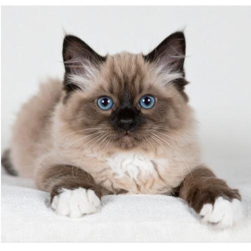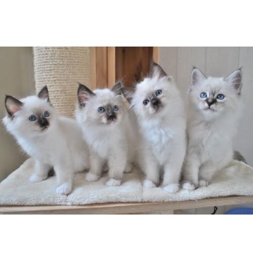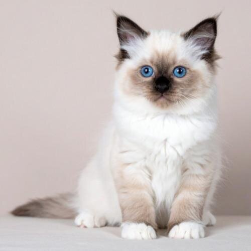 Les points du Sacré de Birmanie ne sont pas aussi marqués dès la naissance. En effet, les chatons naissent entièrement blancs et leurs couleurs se développent progressivement au fur et à mesure qu'ils grandissent. Vers 8 à 10 semaines, les points commencent à se manifester, et la couleur du pelage se stabilise à l'âge adulte. |