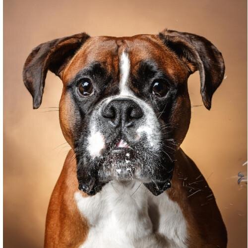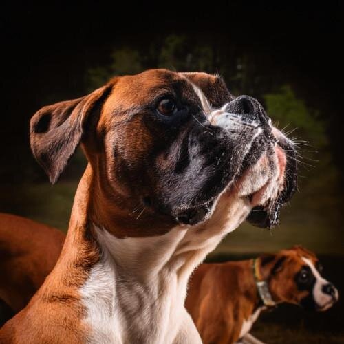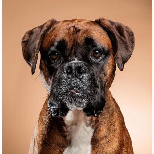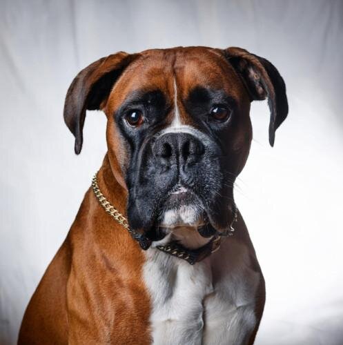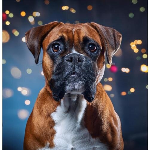 Le Boxer, avec sa silhouette musclée, son museau court et son regard expressif, est un chien puissant et énergique au caractère joyeux. Alliant force et élégance, il est protecteur et affectueux, toujours prêt à jouer, surtout avec les enfants. Intelligent et loyal, il se distingue par sa dévotion et son cœur généreux.