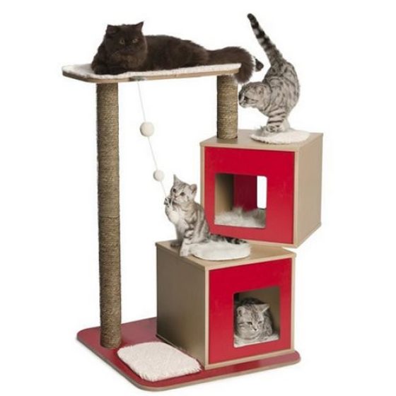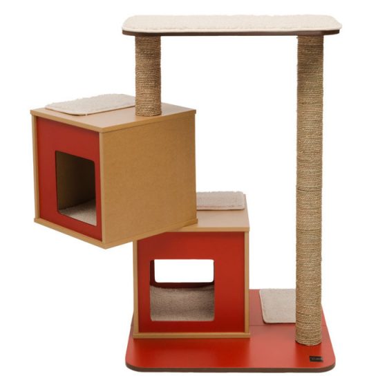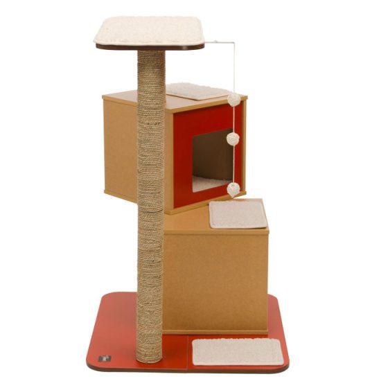 Cet Arbre à chat Base Double Rouge avec niches jumelles de couchage en forme de cube est d'une finition parfaite. C'est une aire de jeu indispensable pour tous les chats d'intérieur. Les différents niveaux invitent le chat à flâner et lui offre également de nombreuses possibilités de grimper, de jouer, de sauter et de se lover en boule bien au chaud sur un coussin à mémoire de forme pour de longues siestes.