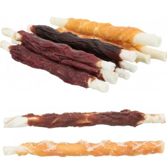 - Comprend un assortiment de sticks à mâcher de peau de boeuf enrobée de viande de poulet, d'agneau ou de boeuf
