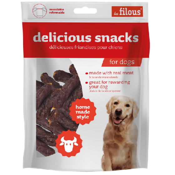 Idéales contre l'ennui, les Friandises saucisse au bœuf Filous contient + 90% de viande.