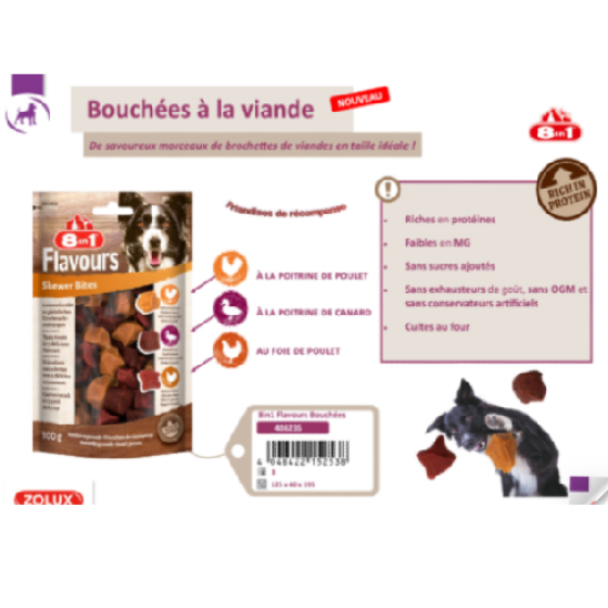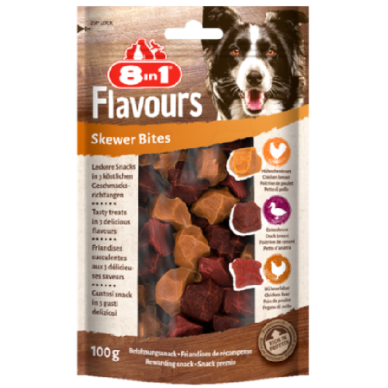 Particulièrement appétentes, les friandises 3 saveurs de 8 in 1 sont composées de viandes cuites soigneusement au four afin de conserver la richesse nutritionnelle ainsi que la saveur des aliments.