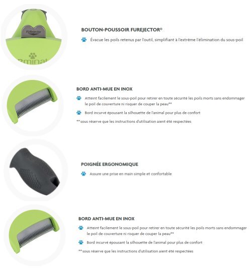- Le boutton pressoir FURejector permet de retirer facilement le poil mort accumulé lors du brossage pour faciliter encore plus le toilettage