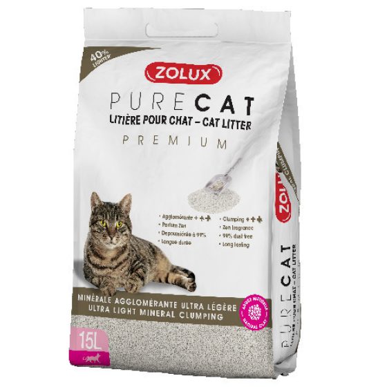La Litière minérale premium Purecat agglomérante ultra légère à des propriétés exceptionnelles et est fabriquée à base d'argile naturelle. Son haut pouvoir agglomérant prolonge sa durée d'utilisation et réduit sa consommation : le sac de 15L permet jusqu'à 90 jours d'utilisation (cette durée dépend du poids du chat, de sa race, de son âge, de son type d'alimentation, du lieu de stockage du bac à litière ....). Son poids plus léger d'environ 40% que les litières bentonites agglomérante traditionnelles la rend plus facile à porter. Au contact de l'urine, les grains libèrent un agréable parfum Zen.