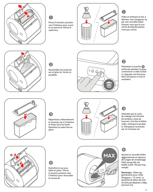 - Peut être utilisé avec de la litière agglomérante (max. 4 litres)