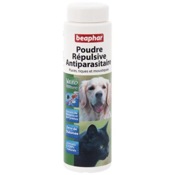 Poudre naturelle Répulsive antiparasitaire pour chien et chat des Laboratoires BEAPHAR - extraits 100% naturel :La poudre naturelle insectifuge Vetonature de chez BEAPHAR pour chien et chat est anti-puces, anti-tiques et moustiques, elle est basée sur l'action de 2 ingrédients naturels réputés pour leur propriétés répulsives.L'efficacité de cette poudre est immédiate.Cette poudre contient des extraits de Margosa (aussi appelé Neem), réputés pour leurs propriétés répulsives contre les insectes et la terre de Diatomée, utilisée depuis des centaines d'années pour lutter contre les parasites dans les silos à grains et dans les jardins, ce sont des fossiles d'organismes microscopiques qui percent la cuticule protectrice des puces provoquant leur déshydratation et leur mort.Comme tout produit répulsif, avant toute utilisation bien lire toutes les informations concernant le produit.Conseils d'utilisation :