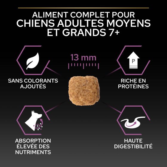 - Soutient la bonne santé des chiens vieillissants grâce à une nutrition adaptée,