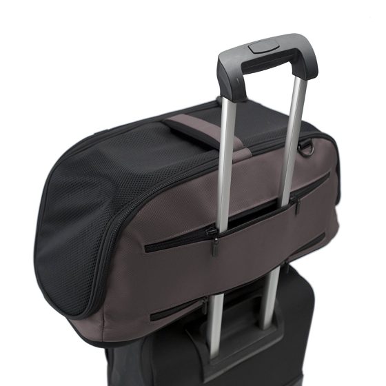 - Possibilité de maintenir le sac sur une valise à roulette grâce à une sangle située à l'arrière du sac