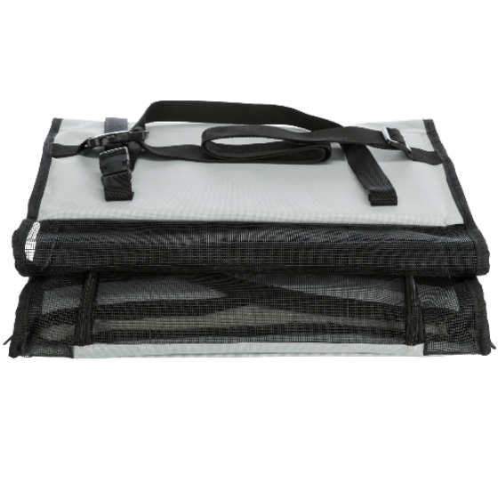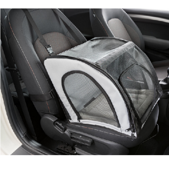Composé en maille de polyester, le Siège de voiture à double ouverture pour chien sous forme de sac à filets assure sécurité et aisance pour votre compagnon.